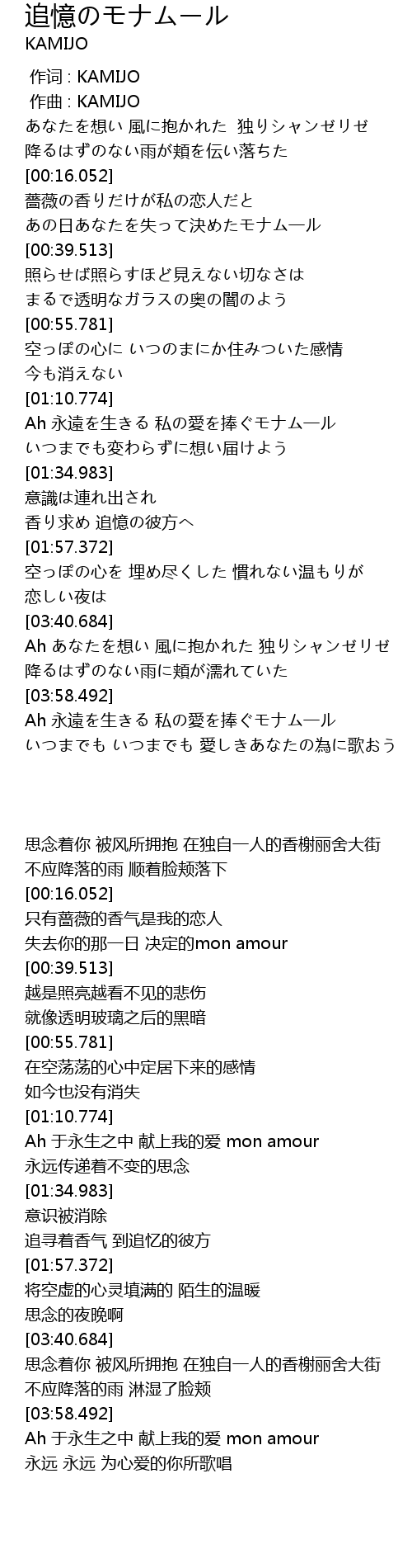 | [01:13.788] | Ah 永遠を生きる 私の愛を捧ぐモナム一ル |