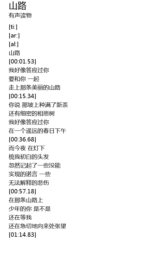 | [01:00.28] | zài nà tiáo shān lù shàng |