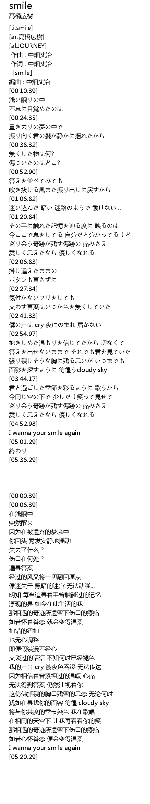 | [04:20.45] | 今同じ空の下で 少しだけ笑って見せて |