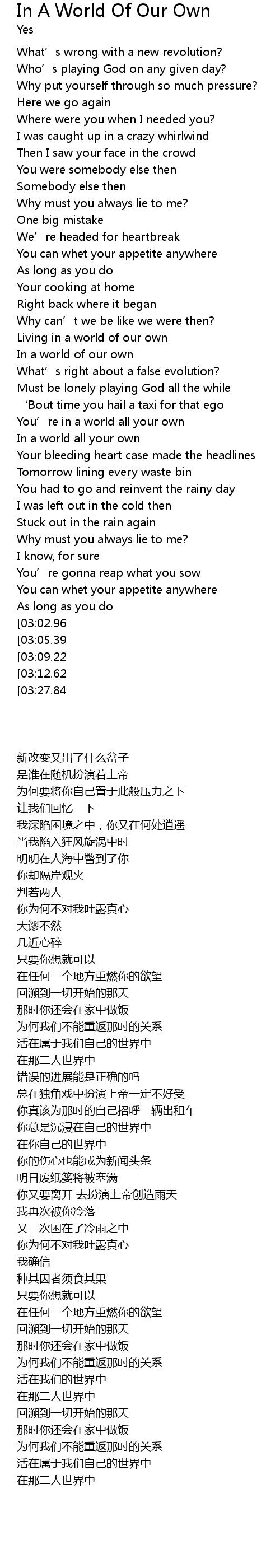 | [04:51.85][03:12.62] | Living in a world of our own |