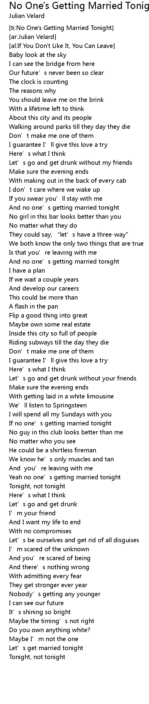 | [02:14.80] | Yeah no one' s getting married tonight |
