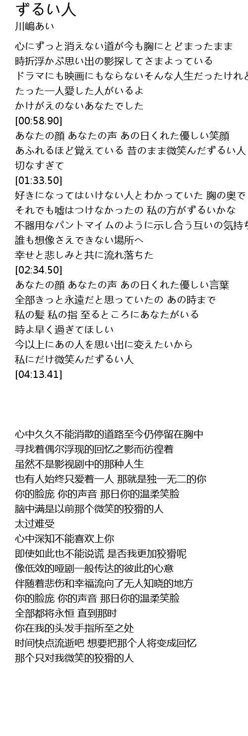 | [01:12.71] | あふれるほど覚えている 昔のまま微笑んだずるい人 |