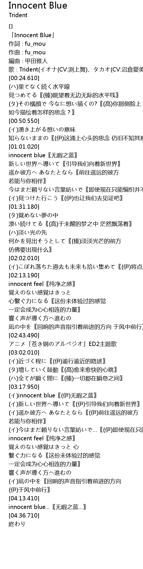 | [03:19.640] | (イ)innocent blue〖(伊)无暇之蓝〗 |
