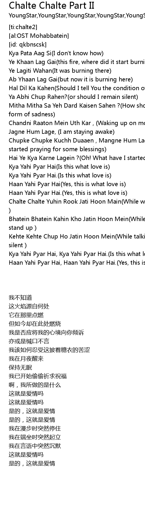 | [01:51.00] | Haan Yahi Pyar Hai, Haan Yahi Pyar Hai.(Yes, this is what love is) |