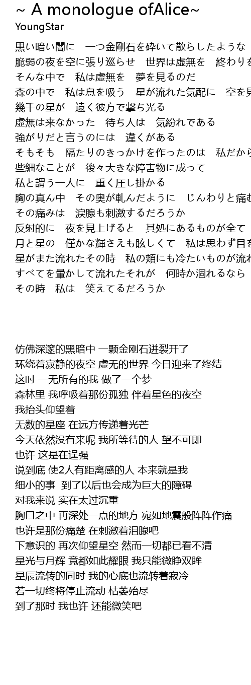 | [01:20] | 月と星の 僅かな輝さえも眩しくて 私は思わず目を細めた |