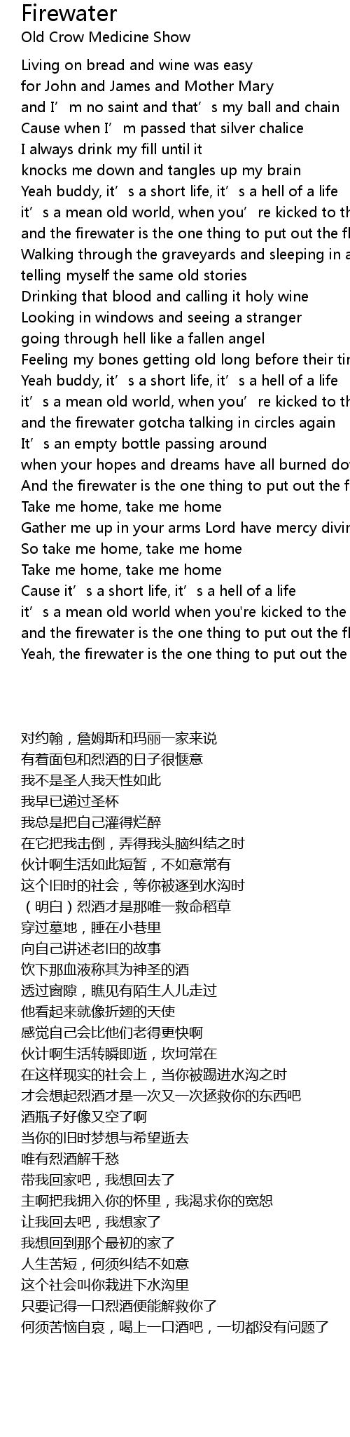 | [00:46.60] | and the firewater is the one thing to put out the flame |