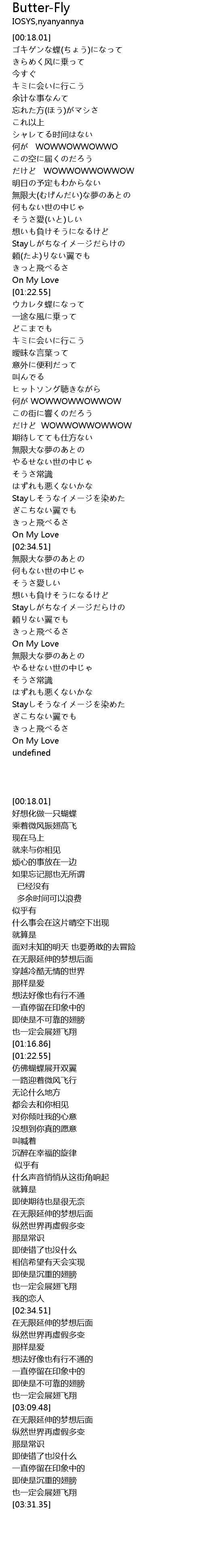| [00:21.68] | ゴキゲンな蝶(ちょう)になって |