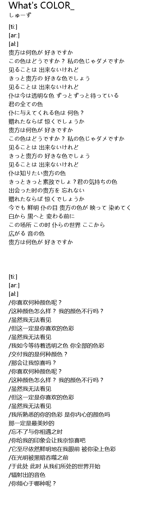 | [02:55.41] | 仆は知りたい贵方の色 きっときっと素敌でしょ?君の気持ちの色 |
