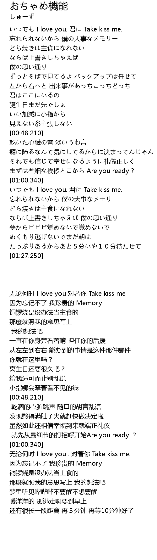 | [00:06.360] | いつでも I love you. 君に Take kiss me. |