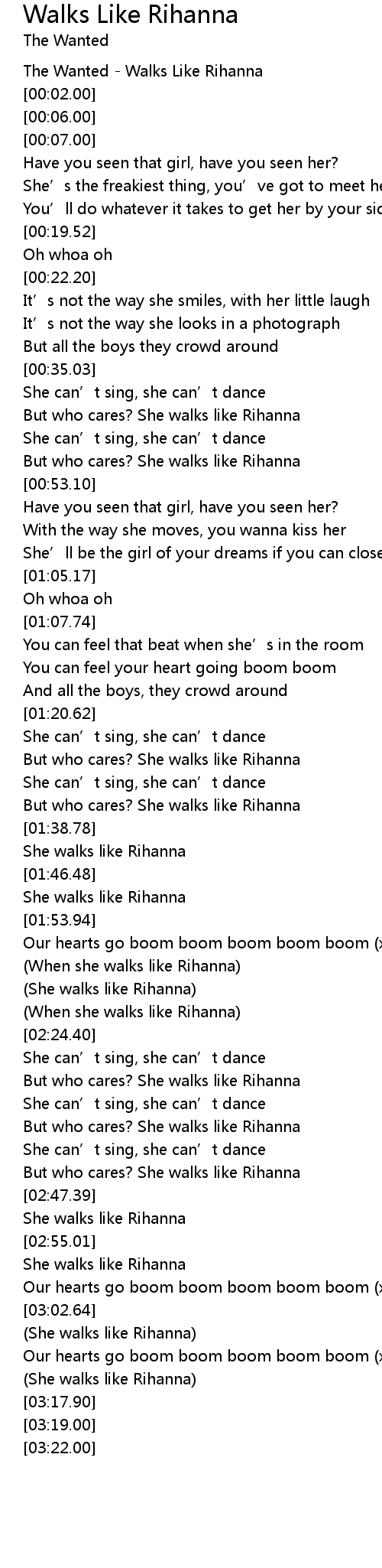 | [03:16.41] | She walks like Rihanna |