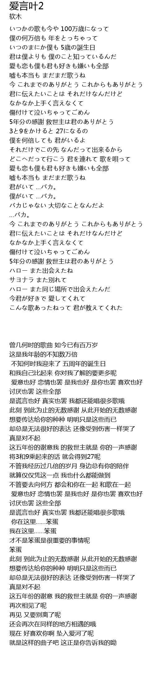 | [00:29.55] | いつかの歌も今や 100万歳になって |