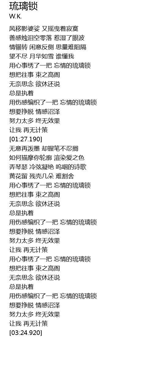| [03:01.510] | 用伤感编织了一把 忘情的琉璃锁 |