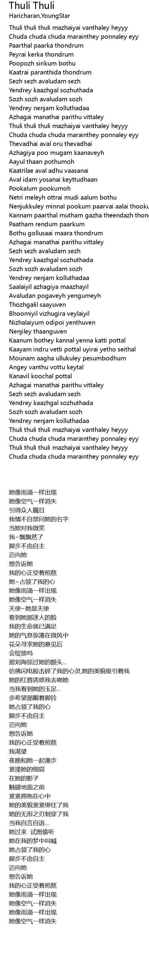 | [04:18.26] | Thuli thuli thuli mazhaiyai vanthaley heyyy |