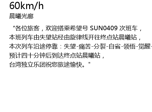 | [04:37.98] | “各位旅客,欢迎搭乘希望号 SUN0409 次班车, |
