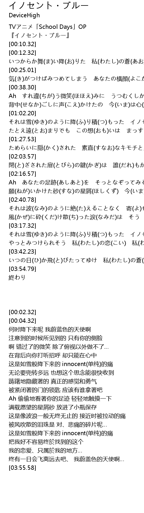 | [03:17.71] | それは雪(ゆき)のように降(ふ)り積(つ)もった イノセントな痛(いた)み |