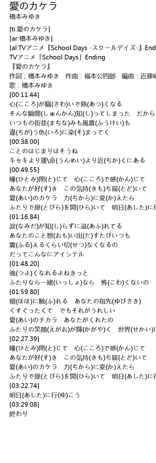 | [00:01.44] | TVアニメ「School Days」Ending |