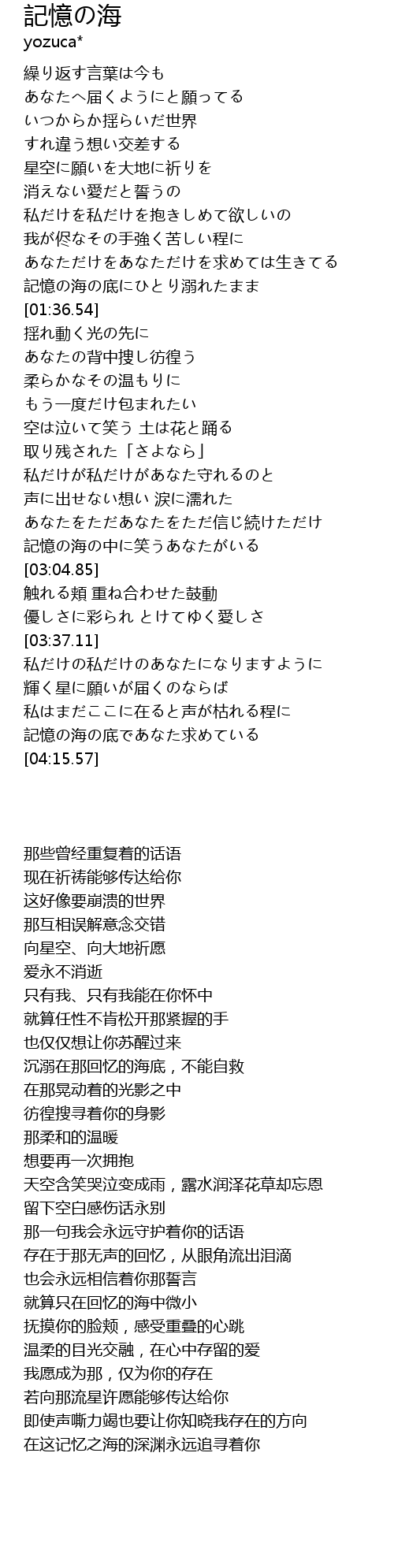 | [02:54.79] | 記憶の海の中に笑うあなたがいる |