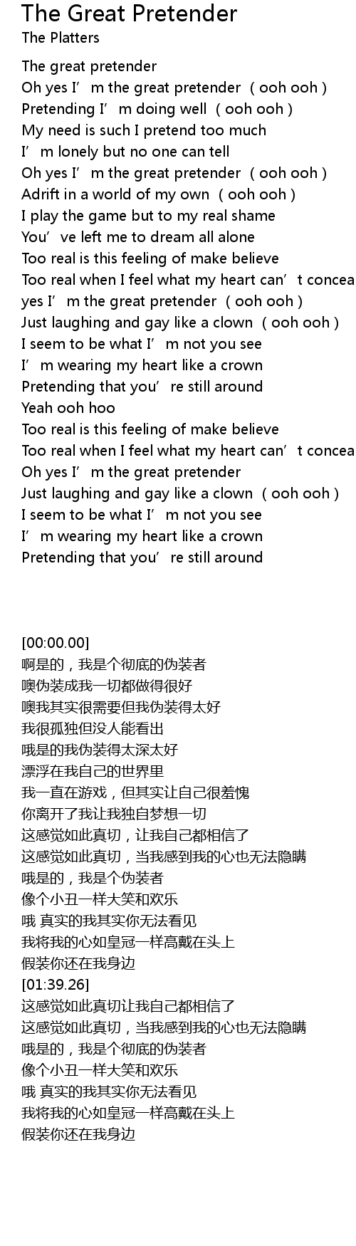 | [00:01.47] | Oh yes I’m the great pretender (ooh ooh) |