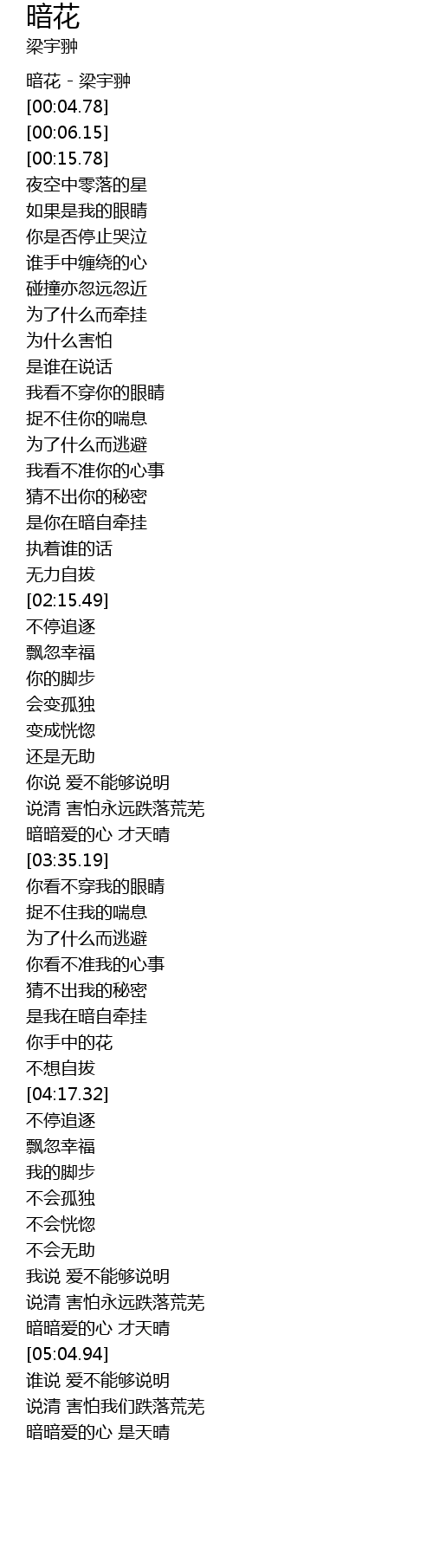 | [00:00.15] | 暗花 - 梁宇翀 |