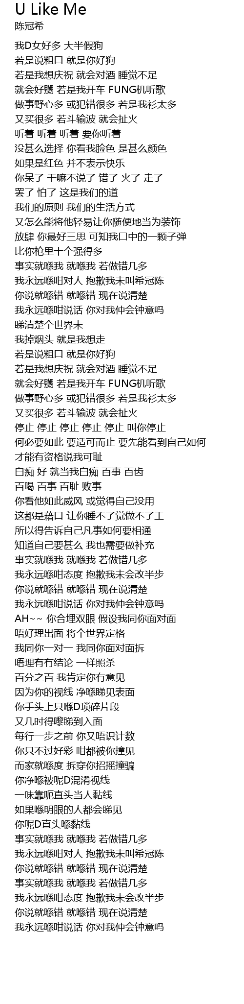 | [01:17.70] | 我永远喺咁对人 抱歉我未叫希冠陈 |