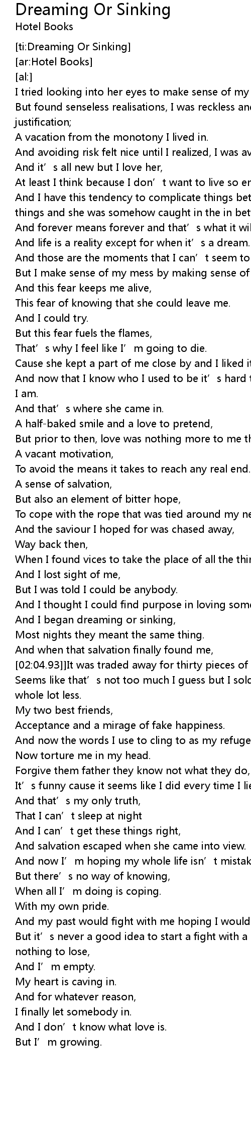 | [01:58.80] | And I began dreaming or sinking, |