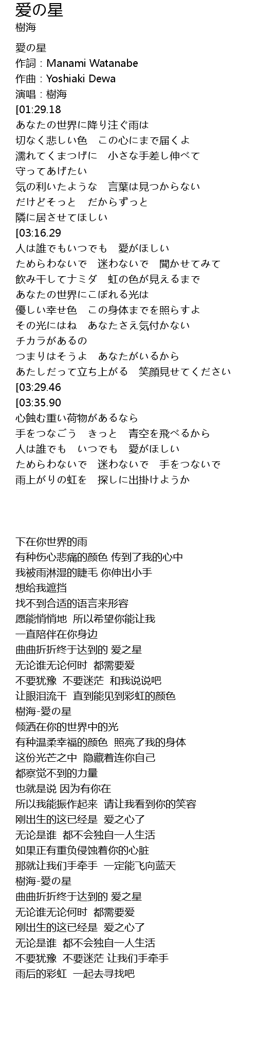 | [00:13.00][01:29.18][02:55.19] | 樹海-愛の星 |