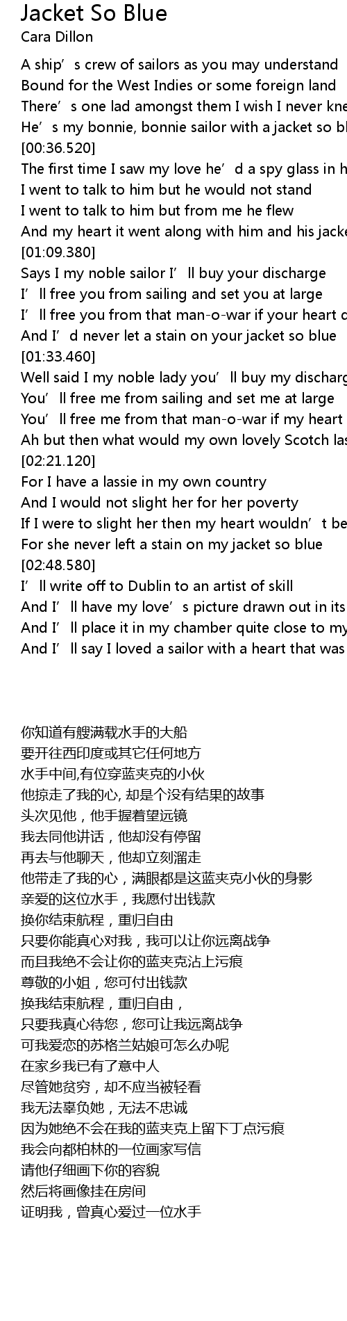 | [00:53.920] | And my heart it went along with him and his jacket so blue ~ |