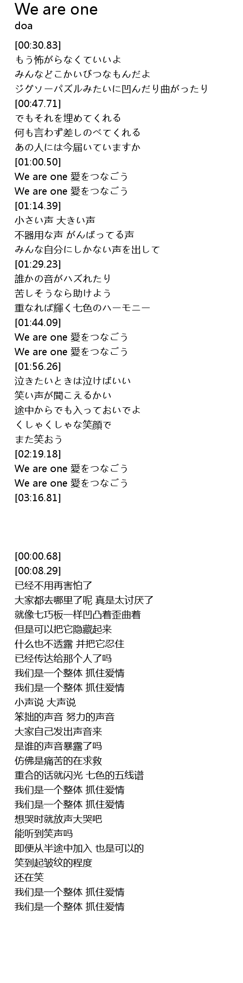 | [02:42.01] | We are one 愛をつなごう |