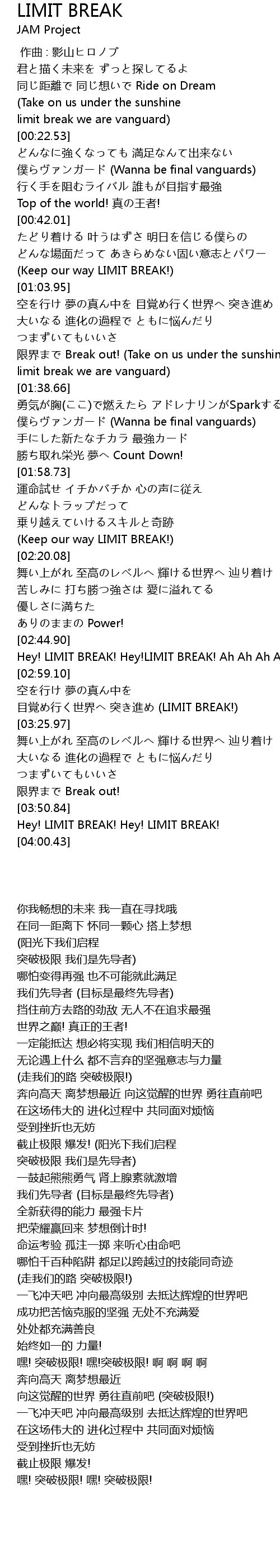 | [02:47.32] | Hey! LIMIT BREAK! Hey!LIMIT BREAK! Ah Ah Ah Ah |