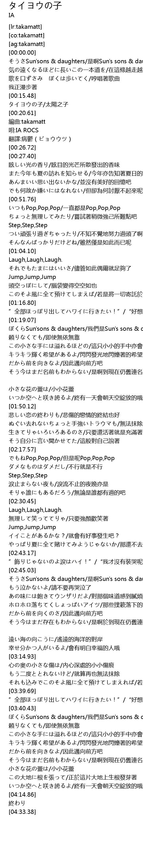 | [00:16.14] | タイヨウの子/太陽之子 |