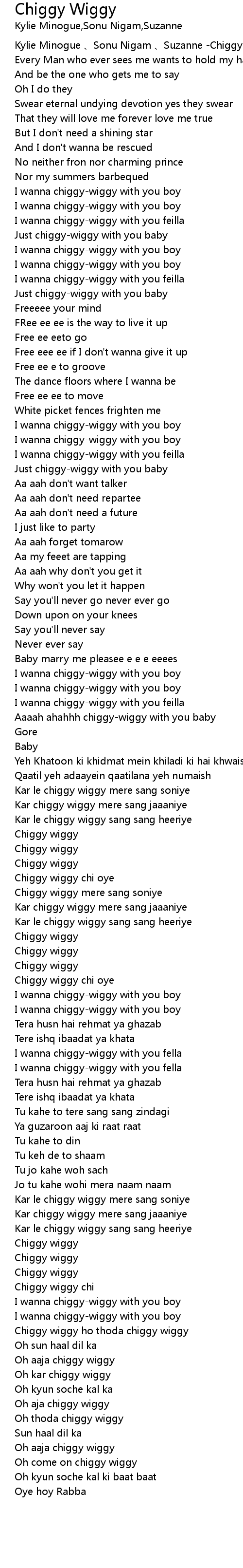 | [00:00.112] | Kylie Minogue 、Sonu Nigam 、Suzanne -Chiggy Wiggy |