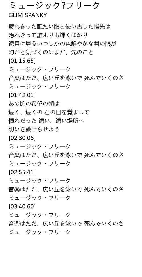 | [03:43.680] | 音楽はただ、広い丘を泳いで 死んでいくのさ |