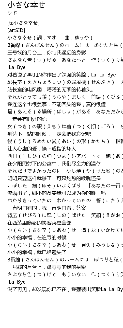 | [00:00.837] | 小さな幸せ(詞:マオ 曲:ゆうや) |