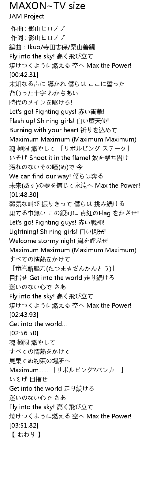 | [03:39.57] | 焼けつくように燃える 空へ Max the Power! |