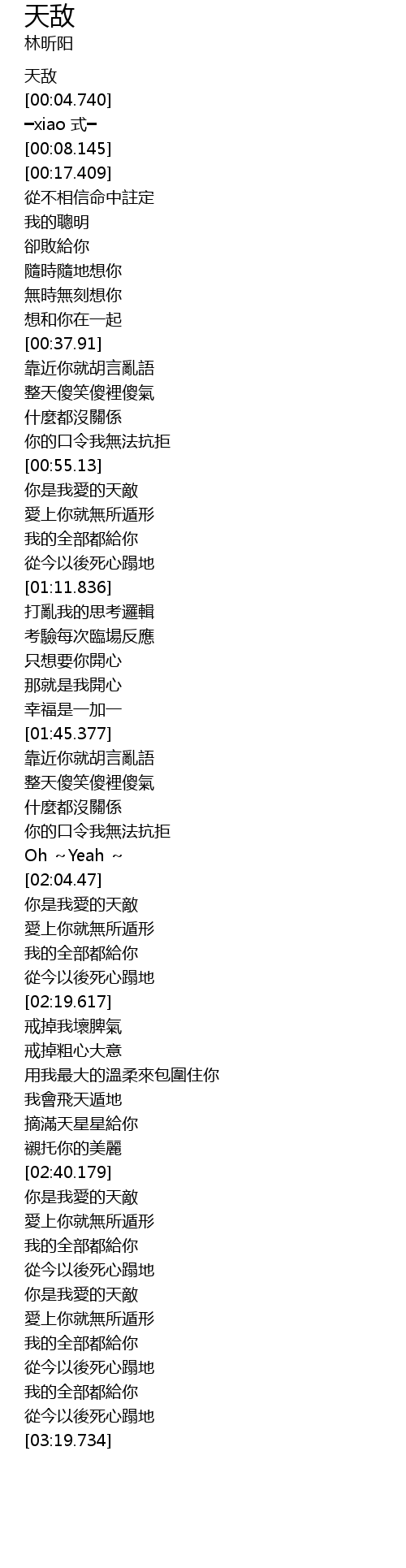 | [02:04.599] | 你是我愛的天敵 |