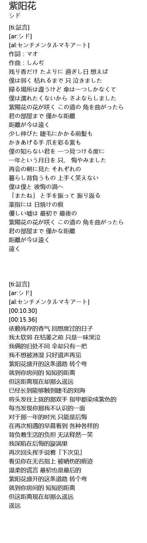 | [00:41.58] | 僕は弱く 枯れるまで 只 泣きました |