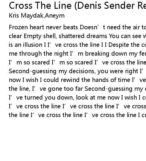 | Frozen heart never beats Doesn’t need the air to live Everything becomes so clear Empty shell, shattered dreams You can see what’s left of me All my live is an illusion I I’ve cross the line I I Despite the consequences Please guide me through the night I’m breaking down my fences The gap is deep and dark And I’m so scared I’m so scared I’ve cross the line, I’ve gone too far Second-guessing my decisions, you were right I’ve turned you down, look at me now I wish I could rewind the hands of time I’ve cross the line I’ve cross the line, I’ve gone too far Second-guessing my decisions, you were right I’ve turned you down, look at me now I wish I could rewind the hands of time I’ve cross the line I’ve cross the line I’ve cross the line I I’ve cross the line I’ve cross the line I’ve cross the line I cross the line |
