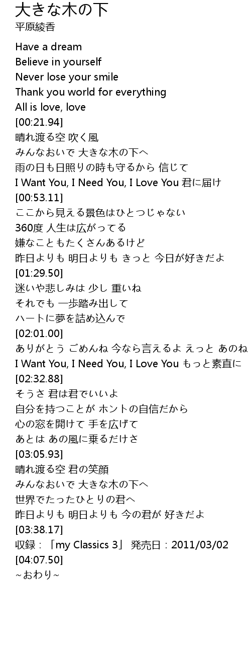 | [03:14.88] | みんなおいで 大きな木の下へ |