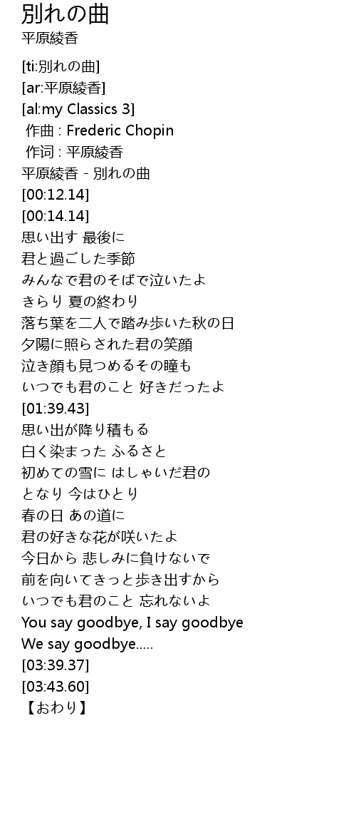 | [00:00.00] | 平原綾香 - 別れの曲 |