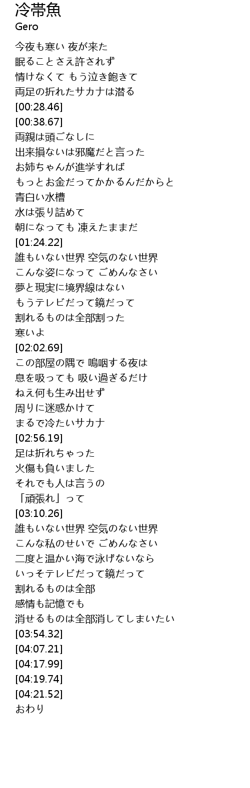 | [00:21.24] | 両足の折れたサカナは潜る |