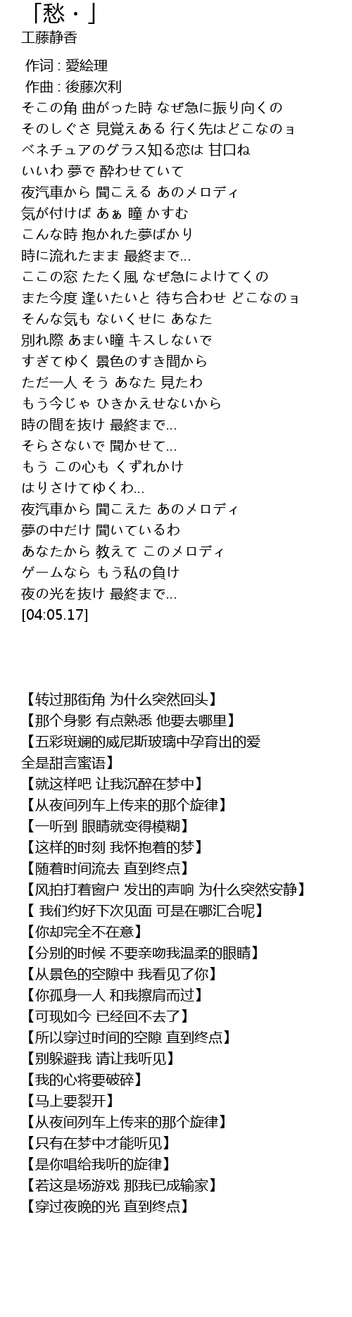 | [00:21.64] | そこの角 曲がった時 なぜ急に振り向くの |