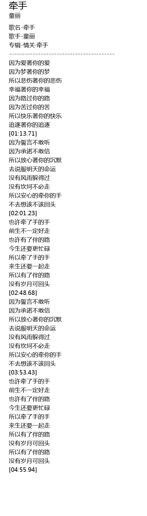 | [04:18.24] | suǒ yǐ qiān le shǒu de shǒu |