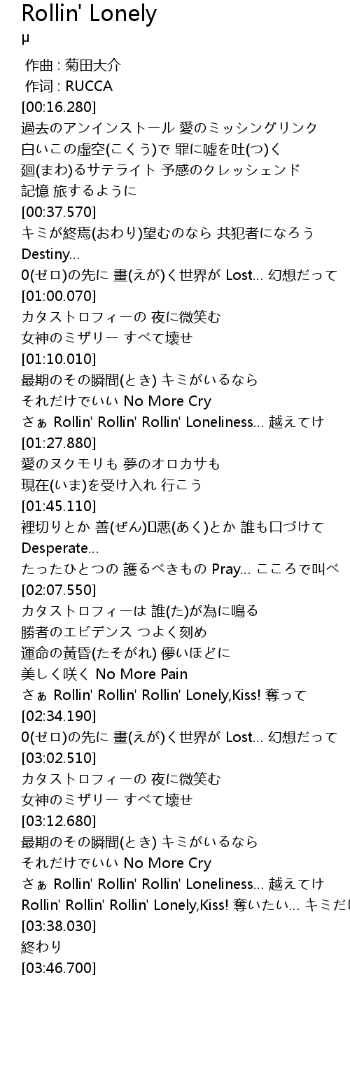 | [03:22.510] | Rollin' Rollin' Rollin' Loneliness yuè |