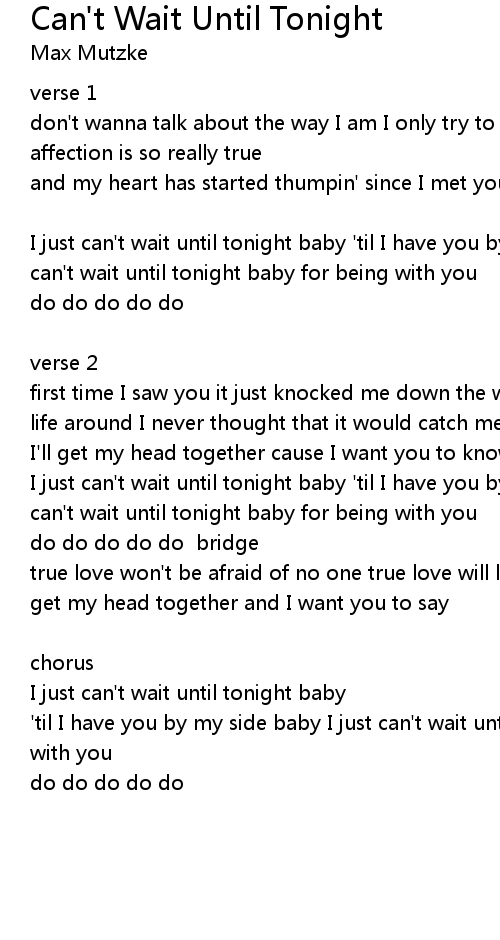 I just can't wait until tonight baby 'til I have you by my side baby I just can't wait until tonight baby for being with you |