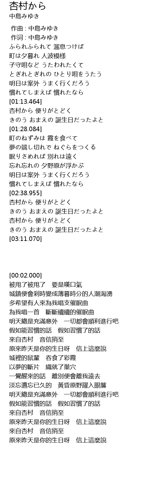 | [02:03.176] | 夢の端し切れで ねぐらをつくる |