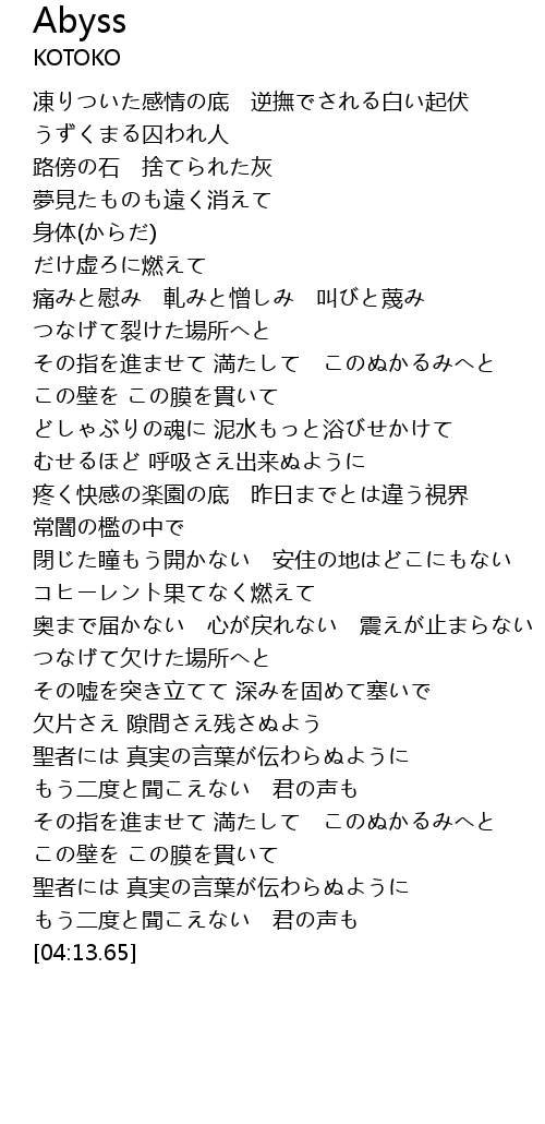 | [00:44.78] | 凍りついた感情の底 逆撫でされる白い起伏 |