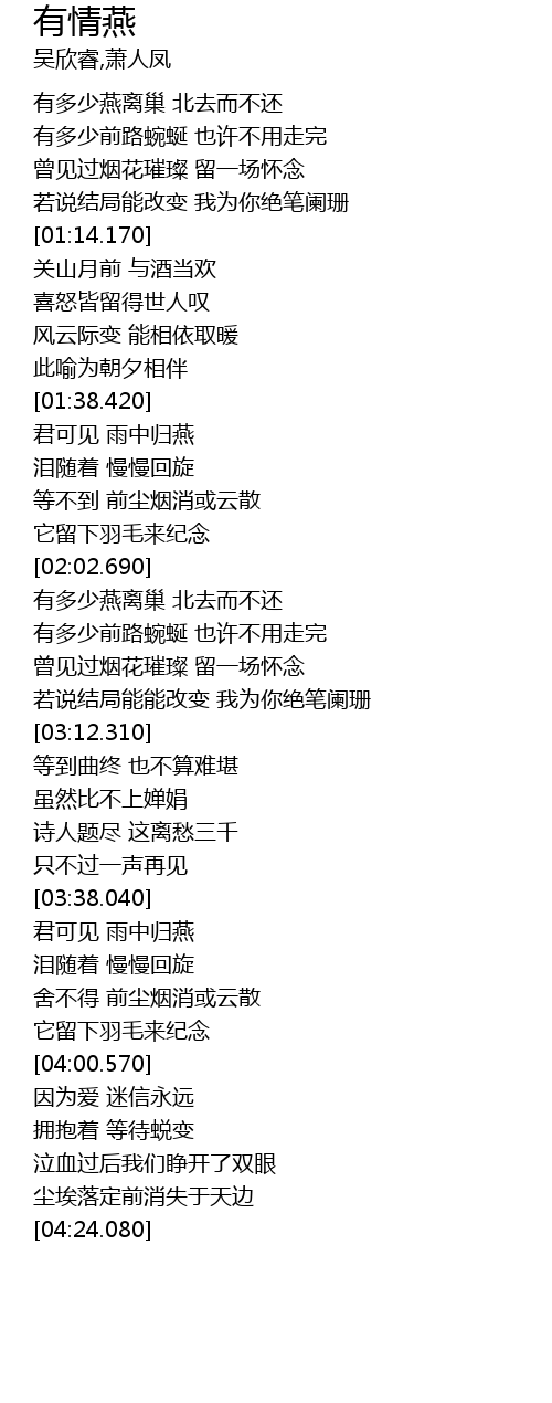 | [00:29.740] | 有多少燕离巢 北去而不还 |