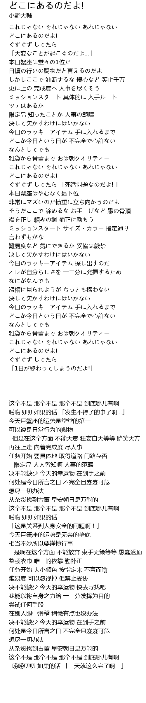 | [02:16.760] | 決して欠かすわけにはいかない 今日のラッキーアイテム 探し出すのだ |