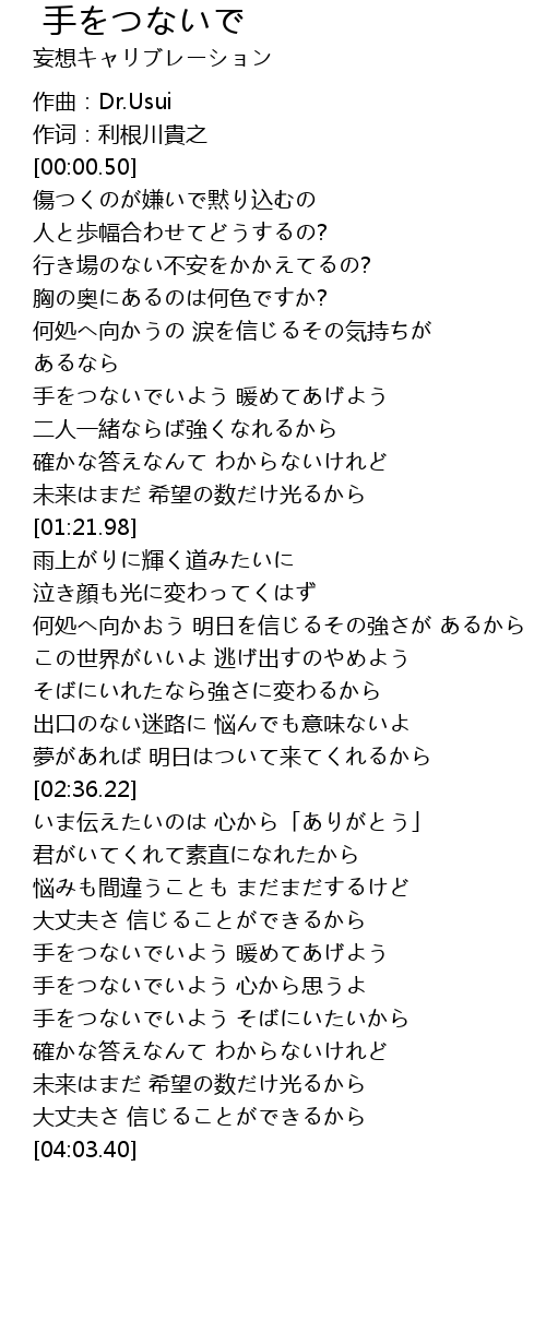 | [03:32.85] | 手をつないでいよう そばにいたいから |