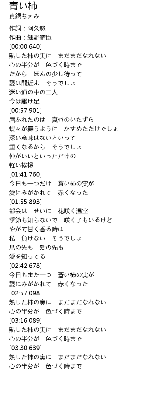 | [01:42.596] | 今日も一つだけ 蒼い柿の実が |